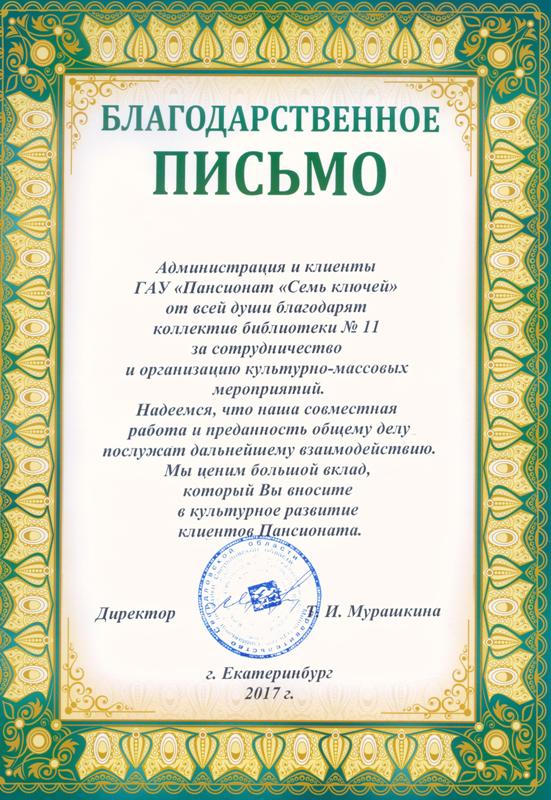 За сотрудничество и организацию культурно-массовых мероприятий администрация ГАУ «Пансионат «Семь ключей»» вручила представителям библиотеки благодарственное письмо.