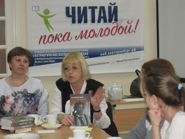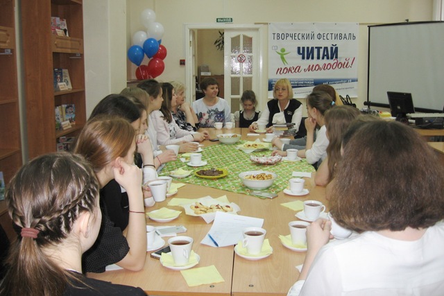 На «Библио-ланч со звездой» пришла директор Театра юного зрителя Евгения Леонидовна Умникова, за чаем она пообщалась в учащимися школ Кировского района.