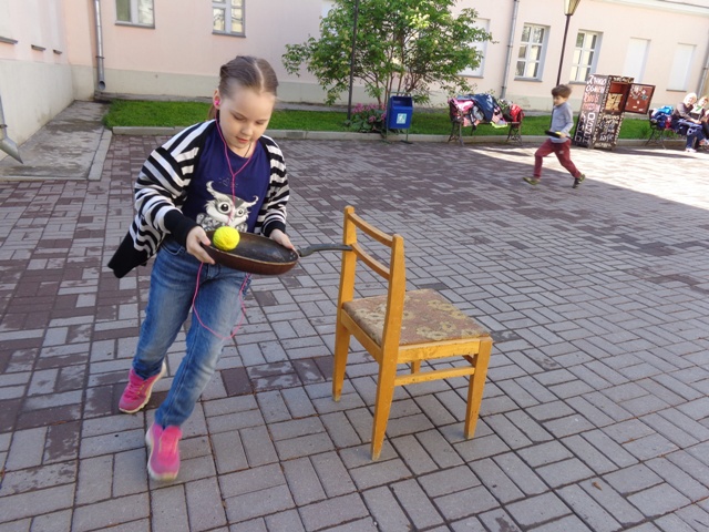 Дети выполняли задания от самой королевы Радуги, например, собрать на скорость кубики синего цвета. Или перенести клубочки желтого цвета из одного конца дистанции в другой.
