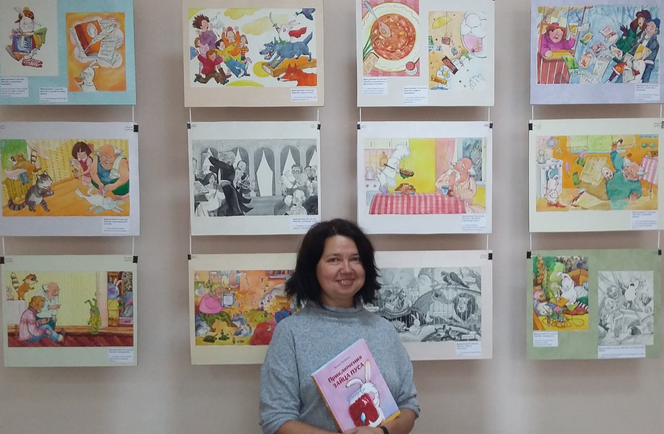 На встречу с художником-иллюстратором в библиотеку пришли школьники. Ребята посетили выставку иллюстраций художника, недавно открытую в библиотеке, и познакомились с книгой Вадима Дубича «Приключения зайца Пуса», которую проиллюстрировала Мирослава Вершинина.