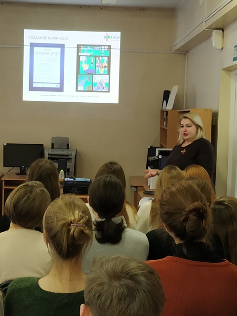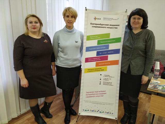 На встречу с представителями ЕАСИ пришли учащиеся 10-11-х классов. Для них провели презентацию деятельности академии, виртуальную экскурсию по двум кафедрам: «Журналистика в области культуры» и «Визуальные коммуникации», консультации заведующих кафедрами и ведущих преподавателей.