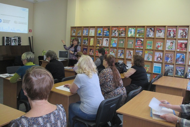 Из презентации гости библиотеки узнали, что к их услугам помимо традиционного книжного фонда предлагается большой набор электронных ресурсов и доступ к национальным электронным библиотекам. Читатели познакомились с такими электронными библиотеками как Национальная электронная библиотека, Национальная электронная детская библиотека и Президентская библиотека им. Б.Н. Ельцина.