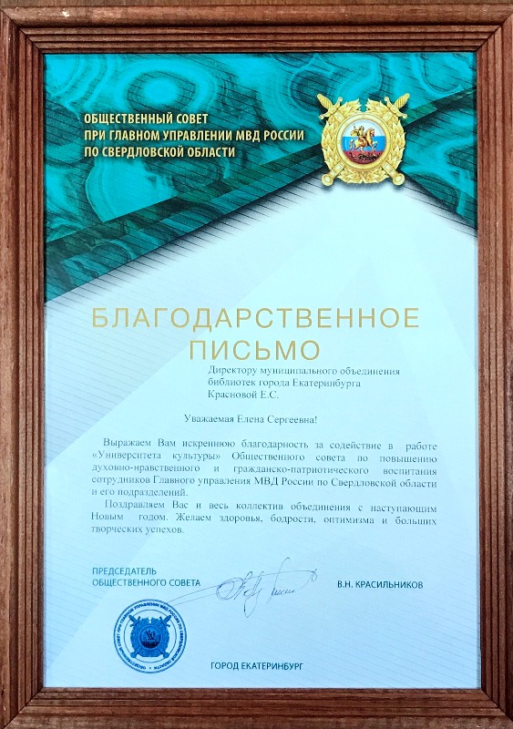 Стоит отметить, что Муниципальное объединение библиотек Екатеринбурга не первый раз сотрудничает с ГУ МВД по Свердловской области. И в преддверии Нового года Общественный совет при ГУ МВД по Свердловской области вручил благодарственные письма директору МОБ Елене Красновой, заведующей библиографического отдела Татьяне Гурьевой и главному библиографу Ирине Елисейкиной.