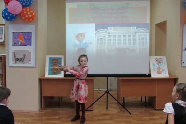 После небольшой фотовикторины «Театры Екатеринбурга» Наталия Александровна рассказала ребятам о Детской филармонии, ее истории, о кружках и студиях, о спектаклях, о традициях. И, конечно, о талисмане Детской филармонии – самом музыкальном уральском коте – Филармонике. К этой встрече в библиотеке был организован вернисаж рисунков музыкальных котов, и по этим рисункам ребята угадывали различные музыкальные инструменты.