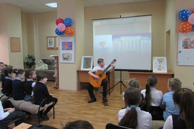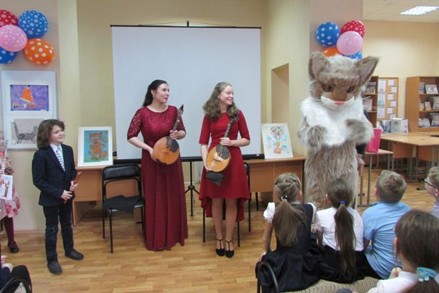 А затем началось самое интересное – юные слушатели увидели и услышали музыкальные истории, рассказанные разными инструментами, такими, как флейта, гитара, домра. Юные артисты Детской филармонии произвели незабываемое впечатление на своих сверстников. Но главный сюрприз ждал ребят впереди — всех гостей приветствовал пушистый Кот Филармоник, который весело мурлыкал и охотно фотографировался со всеми желающими. Вместе с Филармоником юные читатели вспомнили котов книжных и получили за свои знания призы — фирменные блокнотики.