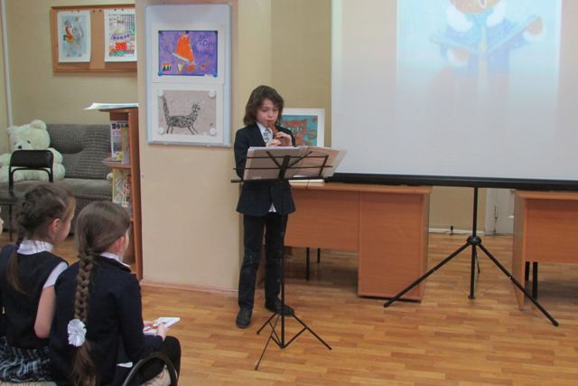 Библиотека им. А.П. Гайдара благодарит юных артистов: Лев Бабушкин – флейта, Оля Игнатьева – флейта, Дима Фоминых – гитара, Ксения Вул и Эльвира Харисова – дуэт домр.