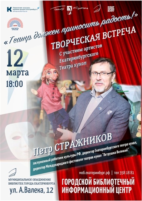 12 марта в 18:00 в Городском библиотечном информационном центре пройдет встреча с Петром Степановичем Стражниковым, директором Екатеринбургского театра кукол, директором Международного фестиваля театров кукол «Петрушка Великий», заслуженным работником культуры РФ.