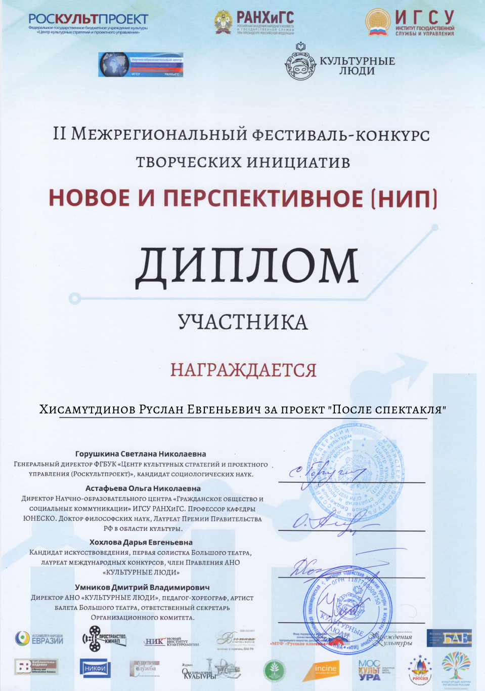 Фестиваль-конкурс творческих инициатив «Новое и перспективное» является межрегиональной площадкой для обмена успешными практиками проектной деятельности в культуре и искусстве, которая функционирует с 2017 года. В этом году мероприятие посвящено Году театра в России. Организационный Комитет рассмотрел заявки участников из более чем 20 городов и 12 регионов. Более 25 проектов были представлены в финале конкурса, победители получили звания дипломантов и лауреатов фестиваля-конкурса, консультации экспертов площадки, поддержку в реализации своих проектных предложений, рекомендации членов жюри. Финал конкурса состоялся 29 марта в Научно-Исследовательском Кинофотоинституте (Москва).