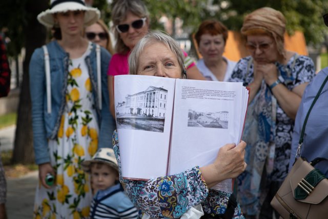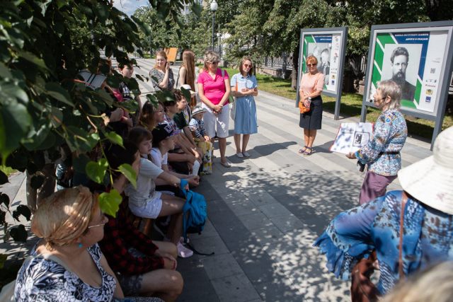 Организаторы предложили гостям библиотеки своими глазами увидеть «бажовский след» в Екатеринбурге и пригласили всех на пешеходную экскурсию «Здесь был Бажов», которую провела известный в городе краевед Елена Ивановна Букей. Основываясь на материале автобиографических повестей и рассказов Павла Петровича Бажова – «Дальнее — близкое» и «Зеленая кобылка» – Елена Ивановна предложила горожанам посмотреть на Екатеринбург глазами 10-летнего мальчика Паши, впервые оказавшегося в большом городе в конце XIX века. В итоге экскурсанты почти полностью повторили маршрут Паши Бажова от  дома Николая Смородинцева  до Духовного училища – этой дорогой он ежедневно в течение полутора лет к 9:00 ходил на учебу. По пути Елена Ивановна обращала внимание на городские объекты, которые юный Бажов запомнил на всю жизнь: каменных атлантов, поддерживающих карниз богатого купеческого дома, большие соборы и храмы, Обжорные  ряды, Хлебную площадь, торговые лавки и многое другое. Словно в виртуальном мире,  через современные здания проступал облик Екатеринбурга XIX  века, и вот уже экскурсанты озадаченно следили за конками, проносившимися по мостовой, за мальчишками, игравшими в Верходановском саду.