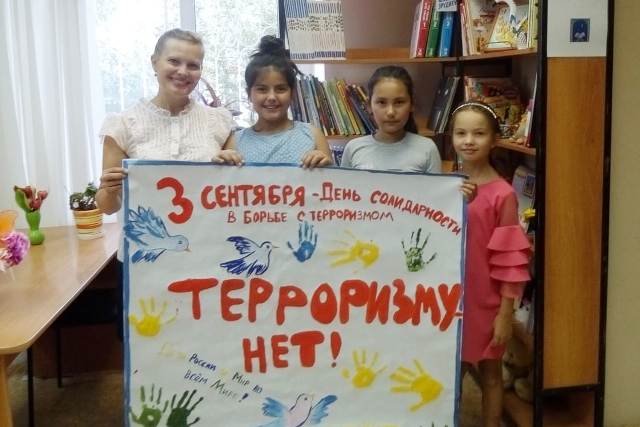 В библиотеке № 42 изготовили своими руками плакаты «Молодежь против терроризма» в память о жертвах террористической агрессии. Ребята разместили свои работы на абонементе для детей, чтобы каждый школьник задумался о том, что, только объединившись вместе, и с уважением относясь к другим нациям и религиям, можно побороть ненависть под названием «терроризм».