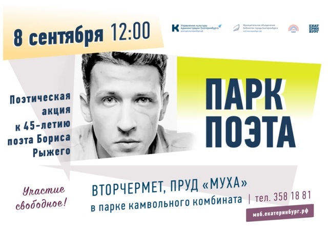 8 сентября в 12:00 Муниципальное объединение библиотек приглашает горожан принять участие в поэтической акции «Парк поэта», приуроченной к 45-летию Бориса Рыжего. Поклонники его творчества соберутся в парке Камвольного комбината у пруда, в народе именуемого «Мухой».