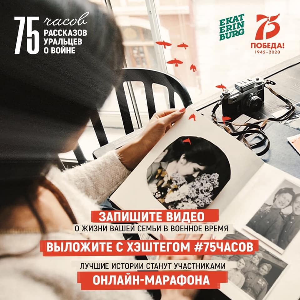 На Урале 75-летие Дня Победы отметят уникальным онлайн-марафоном, в ходе которого люди 75 часов будут рассказывать о жизни своих родных и близких в военное время. Задумано, что истории участники запишут на коротких видеороликах, которые будут транслироваться непрерывно друг за другом. Марафон начнется на площадке «ВКонтакте» в 21.00 5 мая и завершится в полночь 9 мая.