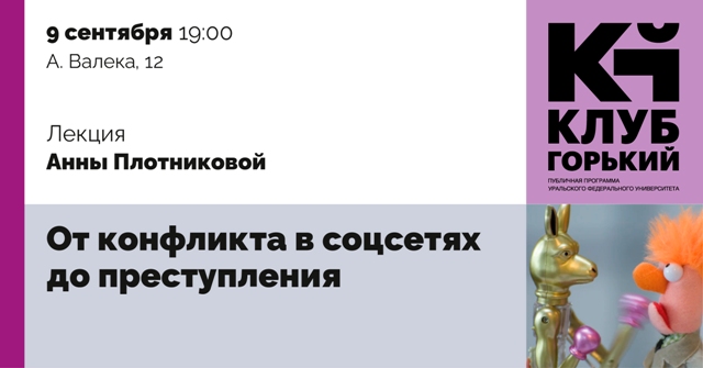 9 сентября в 19:00 в Городском библиотечном информационном центре (ул. Антона Валека,12) пройдет лекция в рамках проекта Клуб «Горький», тема — «От конфликта в соцсетях до преступления: обидные слова и как их избежать».