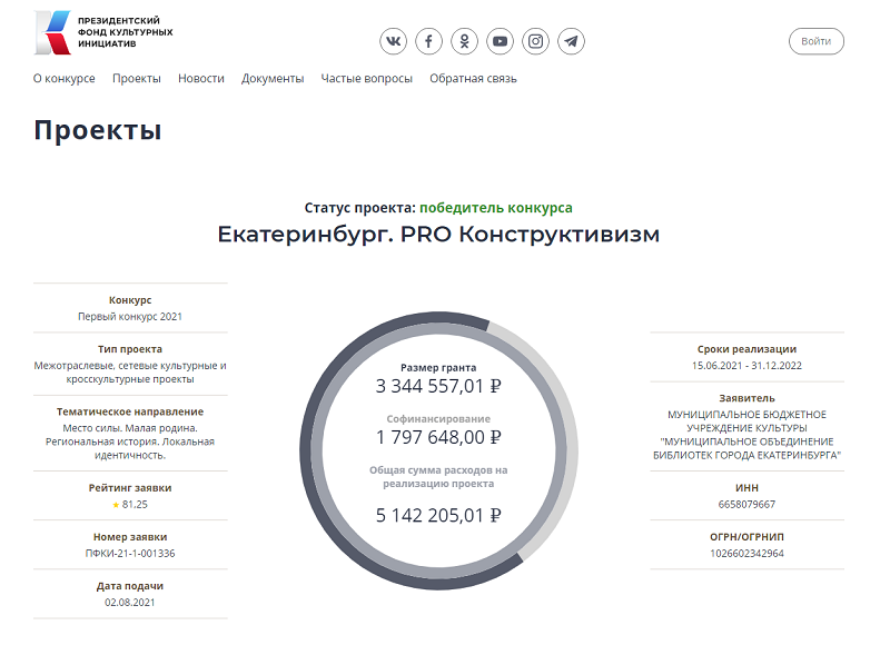 Проект Муниципального объединения библиотек «Екатеринбург. PRO Конструктивизм» вошел в число победителей первого грантового конкурса Президентского фонда культурных инициатив!»Ваша идея смогла победить в острой конкурентной борьбе – ведь конкурс на получение гранта оказался высоким: только одна из 8 проектных команд, подавших заявку, получила поддержку. Это, безо всяких сомнений, повод для гордости. Ваш проект высоко оценили эксперты, и теперь команда Фонда надеется, что такую же высокую оценку он получит от жителей той территории, где будет реализовываться», — сказано в поздравительном письме от коллектива Президентского фонда культурных инициатив.Детали проекта можно посмотреть по ссылке https://clck.ru/XpWAdСовсем скоро поделимся подробностями! Следите за новостями!
