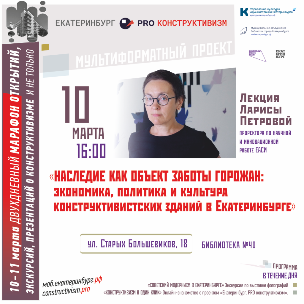 10 марта в 16:00 в библиотеке №40 (ул. Ст. Большевиков, 18) пройдет лекция «Наследие как объект заботы горожан: экономика, политика и культура конструктивистских зданий в Екатеринбурге». Спикер — Лариса Петрова, проректор по научной и инновационной работе Екатеринбургской академии современного искусства. «Право на город» (концепция, идея которой впервые сформулирована французским социологом и философом Анри Лефевром в одноимённой книге «Le Droit à la ville») есть у всех! Применительно к свердловскому конструктивизму право распоряжаться, менять, изучать, охранять есть у жителей, застройщиков, властей, экспертов, общественников, исследователей и других.
