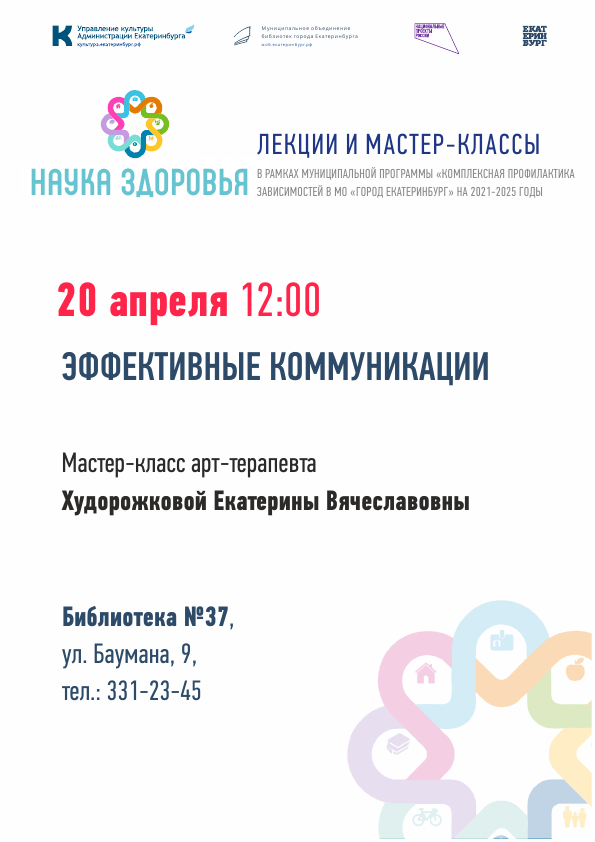 20 апреля в 10:00 апреля в 12:00 в библиотеке №37 (ул. Баумана,9) в рамках проекта «Наука здоровья» пройдет мастер-класс «Эффективные коммуникации». Спикер — арт-терапевт екатерина Худорожкова.