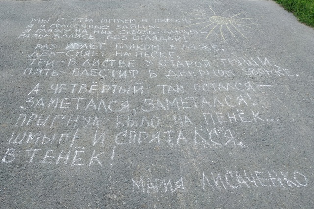 Библиотека №13 уже приняла участие в этом флешмобе. Читатели библиотеки писали на асфальте и читали стихи Марии Лисаченко. Она Публиковалась в журналах «Мурзилка», «Костёр», «Чердобряк», «Путеводная звезда», «Урал», альманахе «Детская» и т.д. Член жюри фестиваля-конкурса «Свободный стих» в Литературном квартале Екатеринбурга. Живет в Екатеринбурге. Посмотреть, как получились «Добрые стихи на асфальте» можно на странице библиотеки ВКонтакте.
