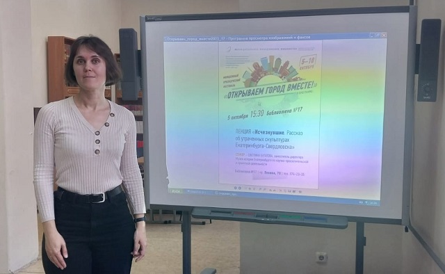 В рамках Молодежного краеведческого фестиваля «Открываем город вместе» в библиотеке № 17 прошла лекция «Исчезнувшие. Рассказ об утраченных скульптурах Екатеринбург — Свердловска». Спикер — Светлана Булатова, заместитель директора Музея истории Екатеринбурга по научно-просветительской и проектной деятельности. На лекцию пришли студенты и курсанты Уральского института Государственной противопожарной службы МЧС России.
