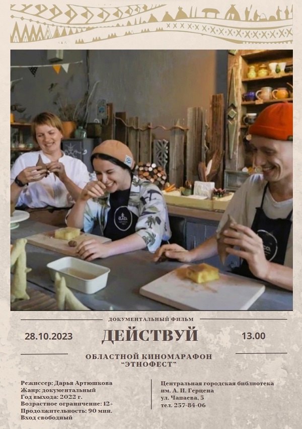 28 октября в 13:00 в библиотеке им. А.И. Герценка (ул. Чапаева,5) пройдет показ документального фильма Дарьи Артюшковой «Действуй» в рамках областного киномарафона «ЭтноФест». В Свердловской области стартовал один из ключевых проектов Фильмофонда – ежегодный Областной киномарафон «ЭтноФест», направленный на содействие упрочению культурных связей между населяющими нашу общую родину народами. Уральцев ждет погружение в мир географических открытий, славянского фольклора, восточных легенд и сказаний, изучение традиций и истории нашей страны. Четыре новеллы альманаха расскажут о повседневной жизни руководителей и резидентов креативных кластеров «Домна» (Екатеринбург), «Арт-резиденция» (Черноисточинск) и «Самородок» (Нижний Тагил). У каждого из героев своя история и свой путь. Зритель узнает, с какими проблемами сталкивались резиденты кластера до появления творческого пространства, а также получит ценную информацию о том, где и как можно заниматься любимым делом: от музыки и дизайна до мыловарения. Режиссёр альманаха Дарья Артюшкова отмечает, что для нее тема развития творчества в регионах России весьма актуальна. Родом режиссер из провинции и хорошо понимает проблемы креативной молодёжи, проживающей в глубинке. На съёмке автор ставит чёткую цель – на живых примерах отследить, как креативные кластеры могут помочь вырасти творцам – дизайнерам, музыкантам, артистам в родной для них среде, но в новом формате. О фильме: Год выхода: 2022 Жанр: документальный Возрастное ограничение: 12+ Продолжительность: 90 мин. Вход свободный.
