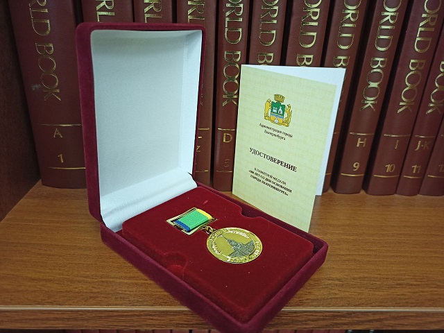 Памятная медаль к 300-летию основания города Екатеринбург вручается лицам, внесшим значительный вклад в развитие муниципального образования «город Екатеринбург». Мэр города Екатеринбурга наградил ею директора Муниципального объединения библиотек Елену Сергеевну Краснову.