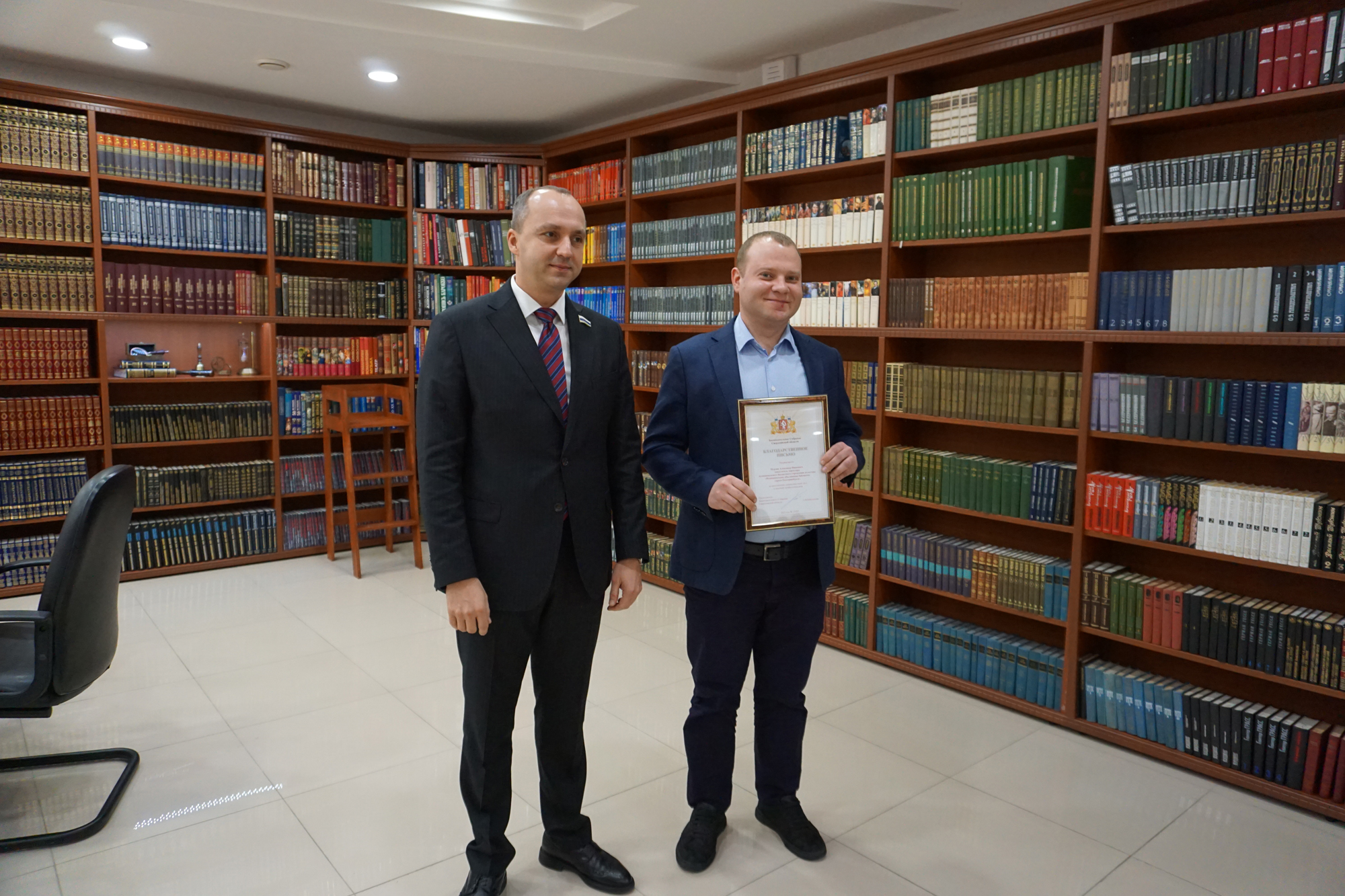 Депутат Законодательного собрания Свердловской области Михаил Клименко сегодня торжественно вручил благодарственные письма Заксобрания специалистам Муниципального объединения библиотек Екатеринбурга!»За многолетний добросовестный труд и высокий профессионализм» благодарственные письма получили:Александр Мурзин — заместитель директора МБУК МОБЕвгения Старкова — главный библиотекарь МБУК МОБРуслан Хисамутдинов — заведующий сектором продвижения библиотечных услуг в сети ИнтернетСветлана Данченко — заведующая Детской библиотекой им. А.П. Гайдара.Поздравляем коллег и желаем дальнейших профессиональных успехов!