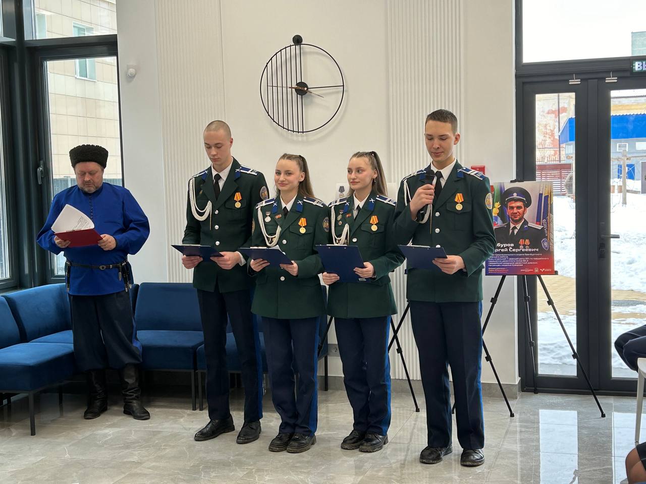После завершения телемоста Наказной атаман хутора «Демидовский», руководитель казачьей молодёжи Свердловской области Максим Воронцов Максим провёл для екатеринбургских студентов экскурсию по выставке «Казаки уральцы – герои специальной военной операции», выставочные экспонаты которой созданы при поддержке #РосмолодёжьГранты #Росмолодёжь #КазакиГерои.