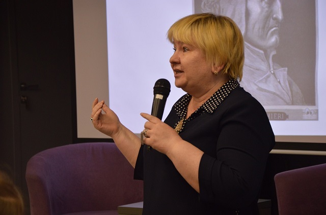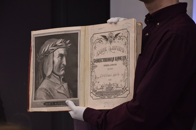 Гостям библиотеки предоставилась возможность познакомиться с уникальным изданием «Божественной комедии» — подержать в руках эту редкую книгу, полистать её страницы и, главное, узнать удивительные факты, связанные с историей её издания. Поклонники Данте услышали рассказ о том, как Дмитрий Минаев переводил поэму, скольких трудов Маврикию Вольфу стоило появление в русском издании гравюр по рисункам Гюстава Доре, как специально для этой книги был разработан новый шрифт и о многом другом.