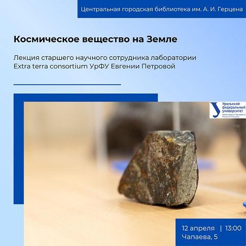 Евгения Петрова — кандидат физико-математических наук, старший научный сотрудник лаборатории Extra terra Consortium  УрФУ, член Международного метеоритного общества. На своей лекции «Космическое вещество на Земле» она расскажет горожанам, откуда берутся метеориты. Слушатели получат ответы на вопросы: что еще летит к нам из космоса, что ученые знают о космическом веществе и как его найти, какие эксперименты проводят у нас на Урале, какие опасности и какие возможности таят в себе «космические пришельцы».