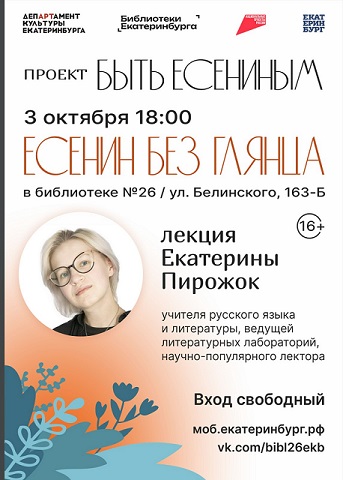 В библиотеке  Екатерина Пирожок прочтёт лекцию, где вы услышите неожиданные и живые истории о  Сергее Есенине. Как произвести фурор в легендарной «Бродячей собаке» без ущерба для кошелька? Как жить с женой, если вы буквально говорите на разных языках? Какие ещё тайны хранит биография московского хулигана?