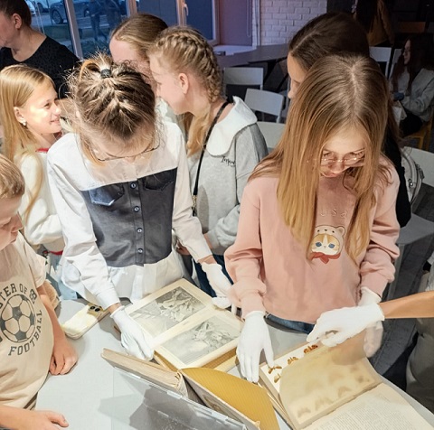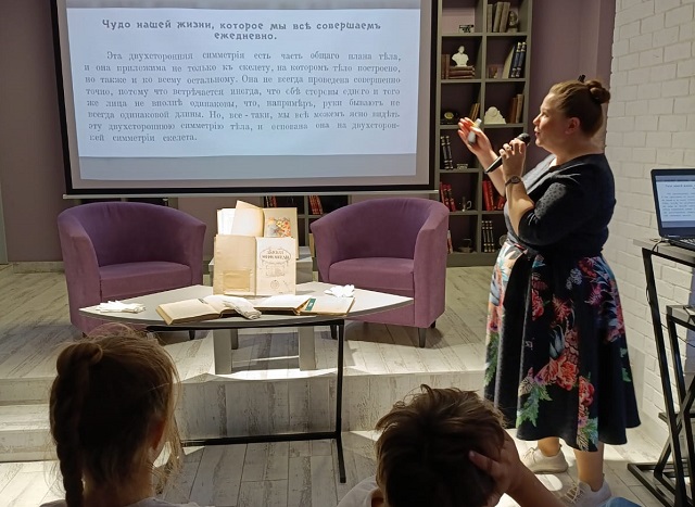 Пятиклассников в это время ждали настоящие приключения – встреча в рамках проекта «”Сокровища слова” – детям». Они открыли для себя уникальное издание – «Детскую энциклопедию», изданную в далёком 1914 году. Школьники познакомились с историей создания первой в России энциклопедии для детей и попробовали прочитать небольшие отрывки. Следует сказать, что это им удалось, несмотря на обилие Ъ и I, а вот значение некоторых слов пришлось современным детям объяснять – изменилась не только орфография, но и реалии. Настоящий восторг у пятиклашек вызвала возможность подержать в руках и полистать книгу, изданную более 100 лет назад. Надев белые перчатки, максимально бережно они прикасались к её страницам и разглядывали иллюстрации.